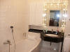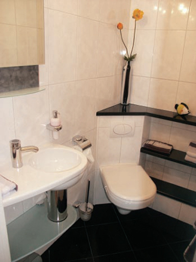 Weniger als 4 Quadratmeter standen hier für die komplette Einrichtung zur Verfügung. „Im Gegensatz zu dem vorherigen Bad war hier die Renovierung des Badezimmers aus dem Jahre 1968 mehr als überfällig“, erklärt Badplaner Manfred Welzel. Viele Jahre hatten die Eigentümer den Umbau vor sich hergeschoben, Angst vor Dreck und vor einer holprigen Koordination der einzelnen Gewerke nannten sie als Grund. „Doch dann konnten Sie ihr Bad einfach nicht mehr sehen, und wir kamen ins Gespräch“, fügt Welzel hinzu. Begeisterung kam bei den Renovierern schnell auf, als der Planer die Idee einbrachte und versicherte, in das winzige Bad auch noch eine Dusche zu integrieren. Nach anfänglicher Skepsis überzeugte Welzel das Ehepaar mit einer ausgeklügelten und stimmigen M3BPlanung. Dank eines Installateurs, der alle Arbeitsschritte inklusive Fliesenarbeiten im Raum koordinierte und als einziger Ansprechpartner in Verantwortung stand, stand der Umsetzung nichts mehr im Wege. Die neue Raumsparwanne wurde auf die gegenüberliegende Seite versetzt, eine – durchaus noch „bewegungsfreundliche“ - Fünfeck-Duschtasse von Bette kam an die Seite rechts neben der Tür. So entstand immer noch genügend Platz, um ein wandhängendes WC („Happy D“ von Duravit) an ein Eckmodul des Herstellers Grumbach zu installieren. Zum Blickfang wurde auch hier ein maßgeschneiderter Granit-Waschtisch mit eingelassenem Villeroy&Boch-Becken. Ein formschöner Designheizkörper von Zehnder ersetzt nun das „antiquierte“ Modell. Der großzügige Spiegel von Zierath, ein praktisches Badmöbel von Sanipa sowie Armaturen von Hansa und Accessoires von Keuco verwandeln das Bad nun außerdem zur gelungenen Wohlfühloase auf kleinstem Raum. So kennt man leider oft auch heute noch ein Zweit- oder Gäste-WC: Überholungsreif. Eigentlich sollte dieser Raum eine Visitenkarte des Hauses darstellen, doch dümpelt die Entscheidung zur Modernisierung oft viele Jahre vor sich hin. Überzeugt vom Umbau des Komplettbades lag es nun nahe, auch hier dringend „Hand anzulegen“. Und selbstverständlich fanden Eigenheimbesitzer und Planer schnell auch hier eine komfortable Lösung und einen Konsens. Das alte Stand-WC wanderte auf den Müll, eingebaut wurde ein pflegeleichtes, wandhängendes Modell von Duravit, was ebenfalls an einem Eckmodul befestigt wurde. Die kleine Abmauerung, die für das Abflussrohr nötig war, wurde kurzer Hand zu einem praktischen Granit-Regal umgewandelt und ist nun kein Störfaktor mehr. Mit dem asymmetrisch geschnittenen Waschtisch und der passenden Armatur „Joly“, den „Mango“-Accessoires sowie den Wand- und Bodenfliesen, die auch für das Hauptbad ausgewählt wurden, ist hier ein echter Blickfang entstanden, in dem jetzt auch Gäste gerne ein wenig länger verweilen werden.